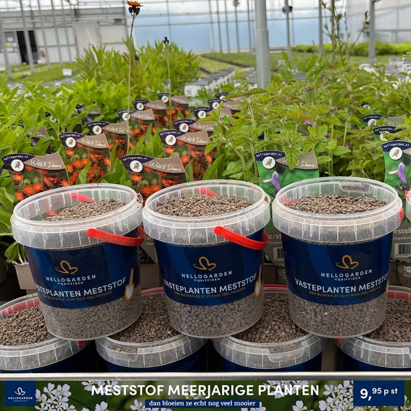 Griffioen Wassenaar verkoopt ook speciale vasteplantenmeststof (complete pakketten inclusief rek en banner) voor directe verkoop bij de Hello Garden tafels. De verkochte emmertjes zijn handige consumentenverpakkingen met 600 gram mest voor 10 m² border.